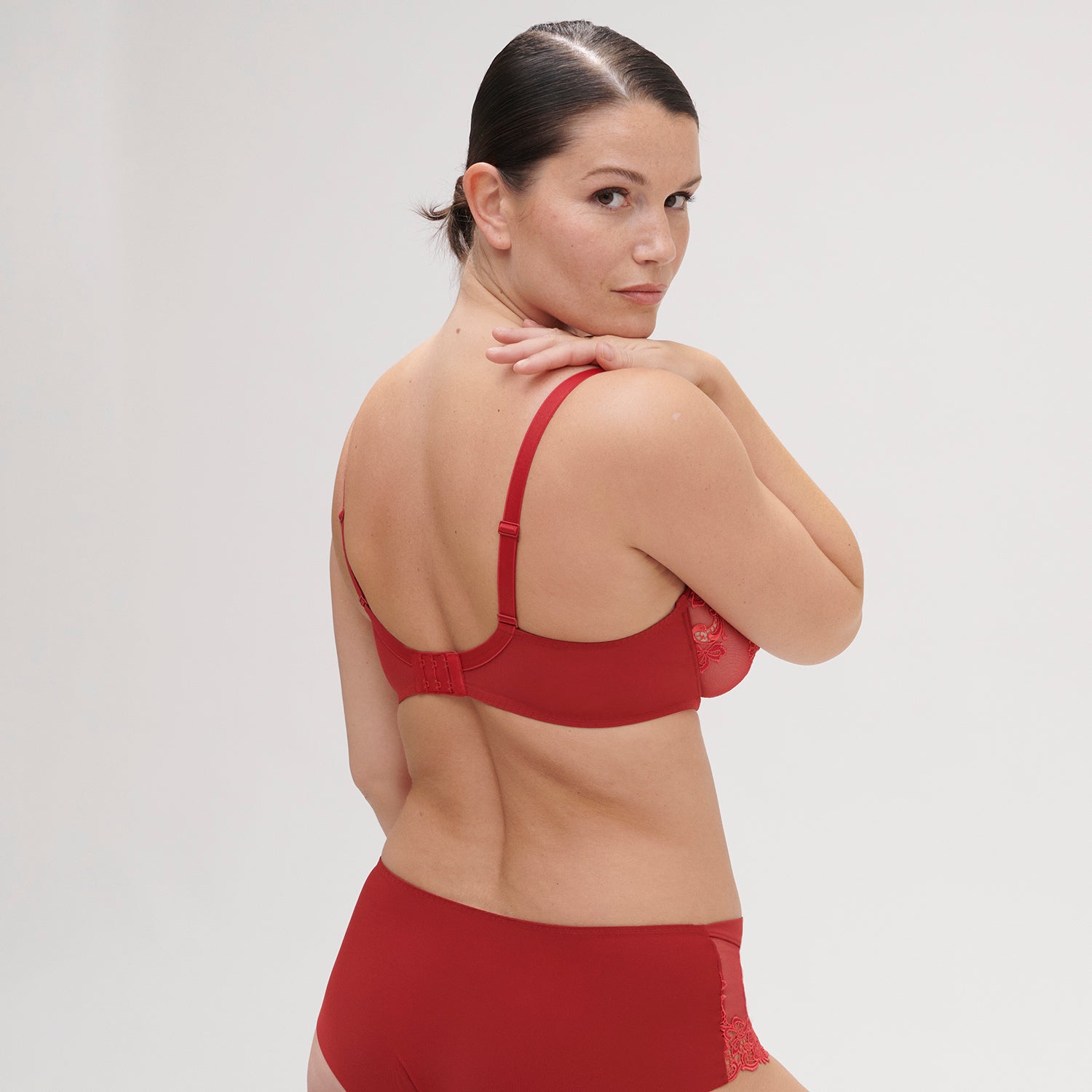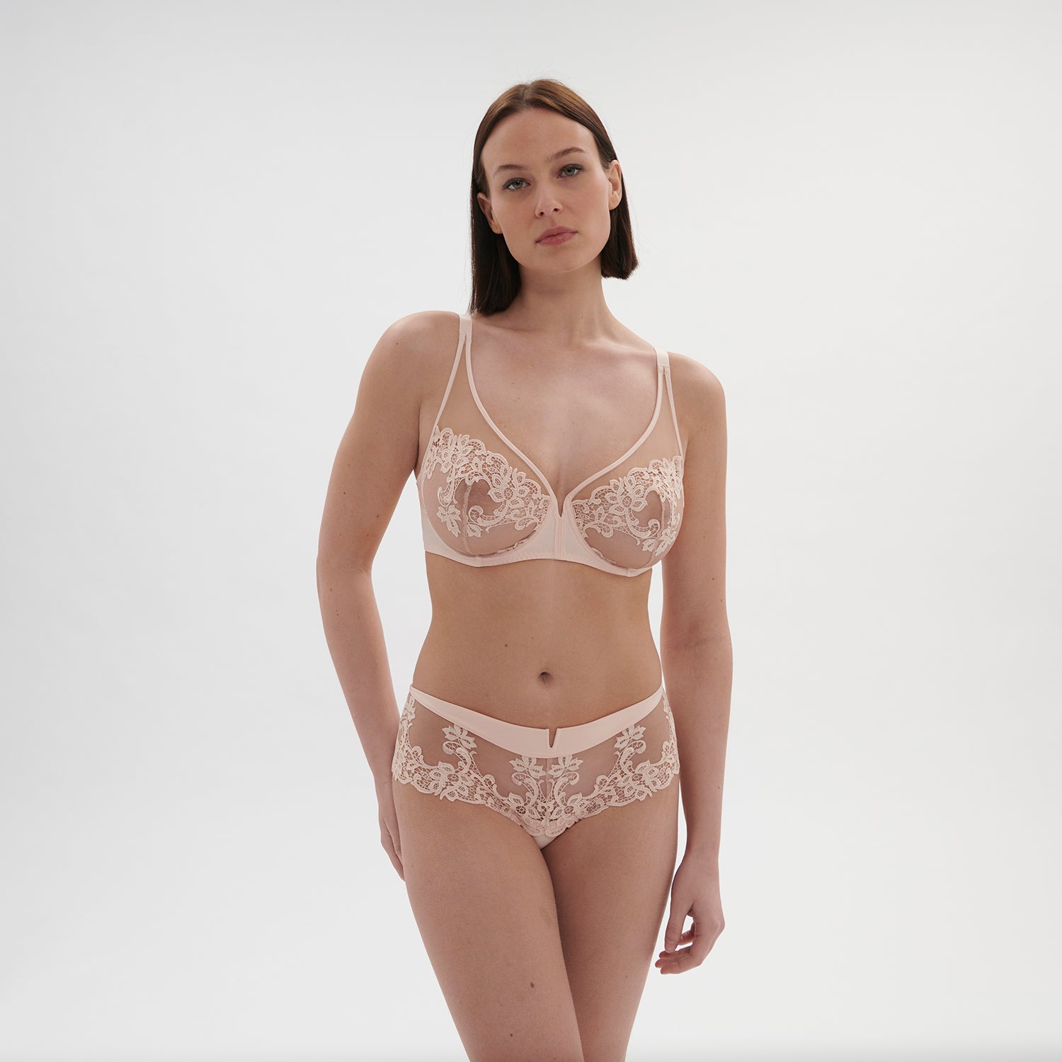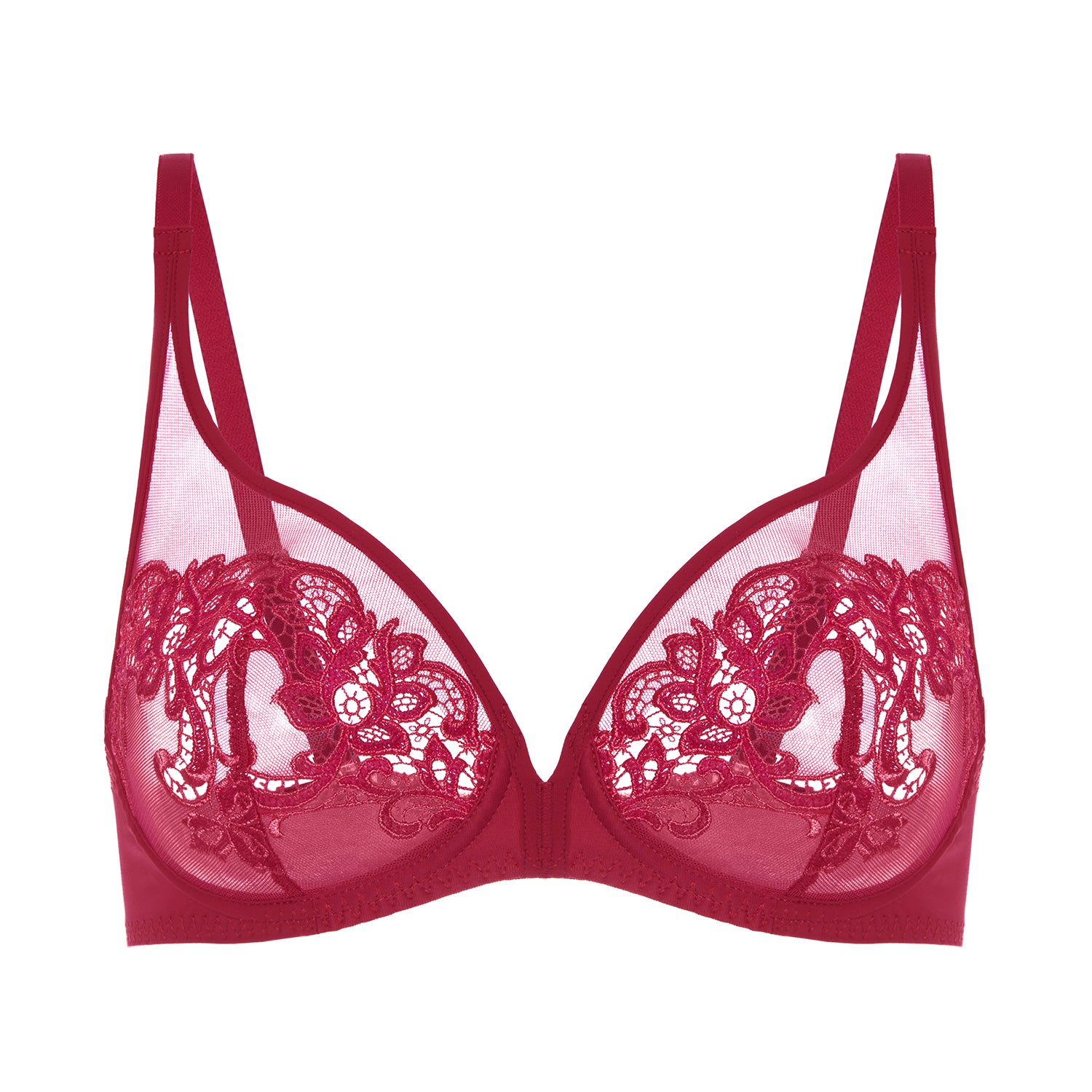 Ever-popular Saga from Simone Perele. This lace is absolutely stunning. Soft and elegant. Romantic embroidery against a backdrop of sheer mesh makes this bra effortlessly sexy. Featuring Simone Perele’s best-selling silhouette, well-known for its comfortable coverage and plunging neckline, this style is every bit as supportive as it is decadent.